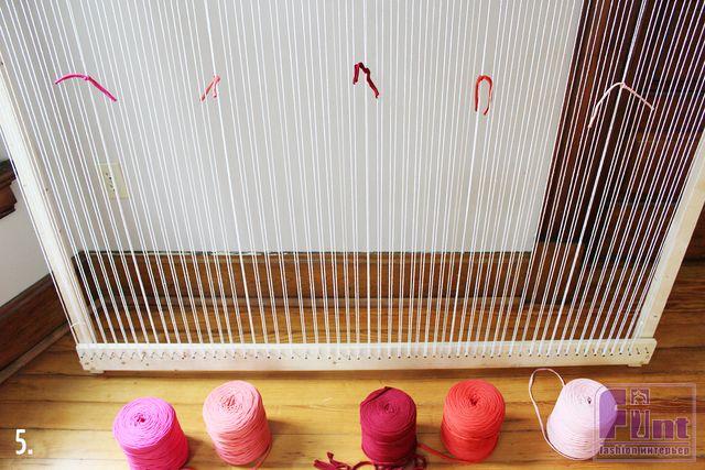 Шаг 6: Начните «ткать» первую часть от центра секции, используя примерно 1,5 -2 метра пряжи. Оставьте 10-сантиметровый конец пряжи на «изнанке» ковра и переплетайте приблизительно через 20 рядов ниток (10 гвоздей). Вплетайте нитки классическим зигзагообразным движением, чередуя пропускание пряжи над и под нитями.