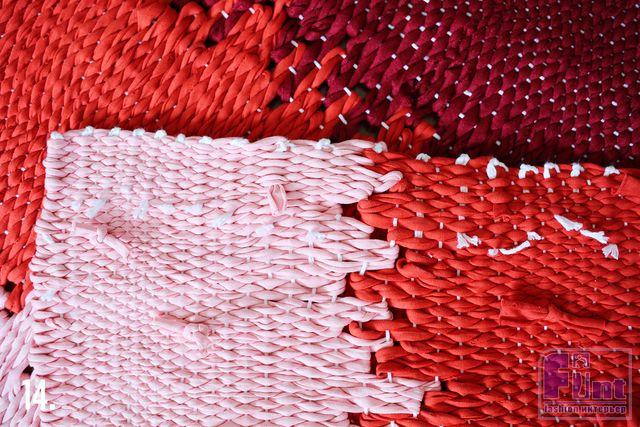 Шаг 11: Необходимо ткать коврик постепенно, переходя от цвета к цвету. Если делать коврик такими полосами, то он получится равномерным по натяжению. Если же Вы будете ткать не горизонтальными, а вертикальными полосами одного цвета, то коврик может сильно деформироваться.