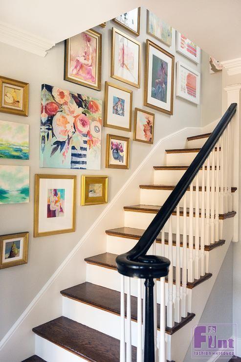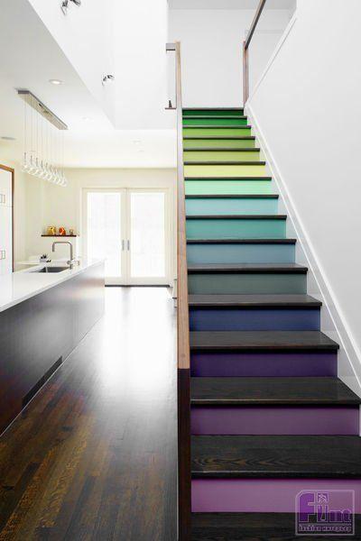 Отличная идея для загородного дома в несколько этажей – покрасить какой-либо элемент лестницы: перила, ступеньки, опоры. Выбирайте подходящую краску, начинайте работу с верхней ступеньки и, конечно, экспериментируйте с цветами и оттенками.