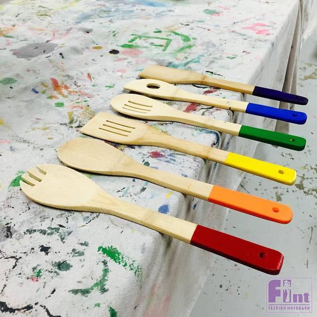 Покрасить посуду вручную – проще простого. Для стекла и керамики подойдёт акриловая краска, для дерева же существуют безвредные пищевые краски и лаки. Помните, что краска должна наноситься снаружи, с внешней стороны тарелок или кастрюль, чтобы впоследствии не соприкасаться с пищей. Используйте также простой и оригинальный DIY-способ покраски: обмотайте верхнюю часть, скажем, лопаточек, малярным скотчем, и обмакните их в краску – вы получите эффектные полосы, сможете создать оригинальные узоры.