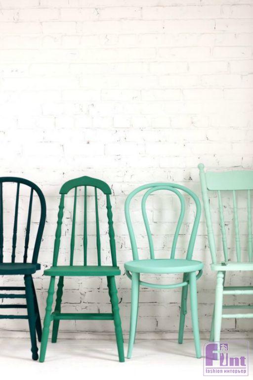 Обновите интерьер кухни, столовой или даже балкона, покрасив старые деревянные стулья в яркие цвета. Причем они необязательно должны быть одинаковыми – проявите фантазию! Используйте специальную мебельную краску, а затем нанесите на стулья слой прозрачного лака (матового или глянцевого).