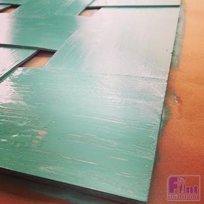 Затем берём в руки строительный степлер и прикрепляем на одинаковом расстоянии друг от друга полосы шпона к раме. Места соединения полосок промазываем клеем ПВА. По-горизонтали вплетаем полоски шпона в «шахматном» порядке, закрепляя их по бокам. После того, как закончили плетение, прикрепляем вертикальные полосы к нижней части нашей рамы. Чтобы наше плетение надёжно закрепилось, можно поставить на места переплетения, промазанные ПВА, стулья или другие тяжёлые предметы.