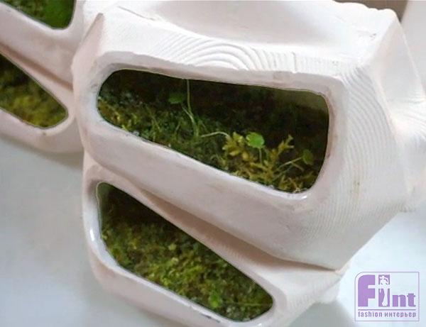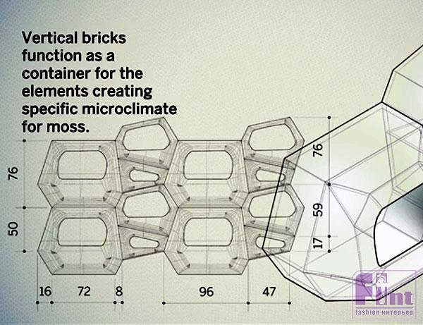 Для того чтобы проверить свою теорию, Елена создала специальный прототип. Он состоит из нескольких полых отсеков-модулей, соединённых в единую фасадную структуру. Отсеки выполнены из керамики - природного материала, способствующего созданию внутри ячейки особого микроклимата. Внутреннее дно глазуровано, а остальная часть представляет собой пористую глину.