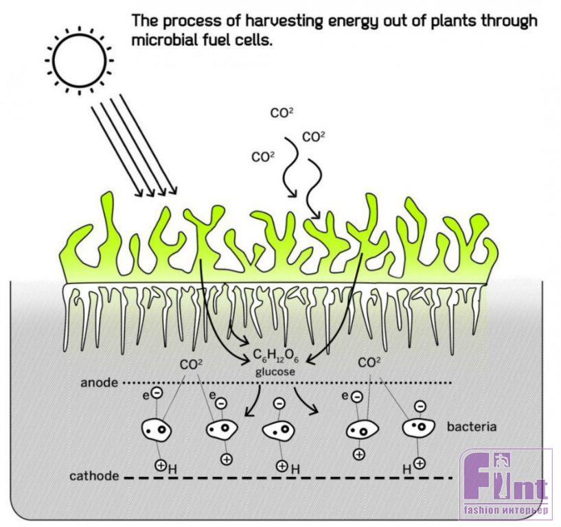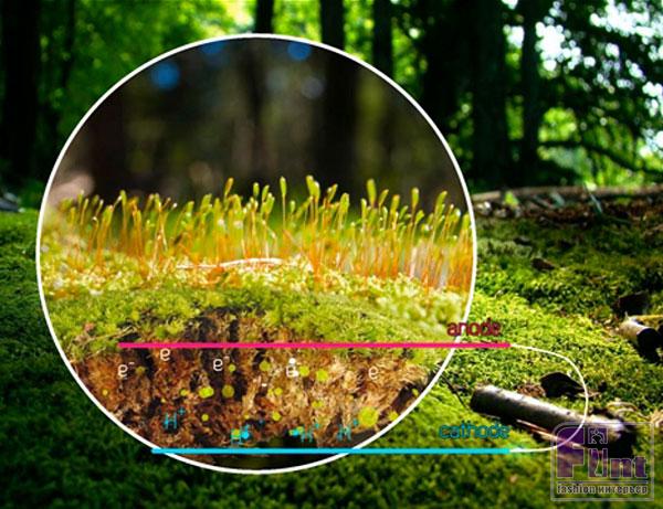 В каждую ячейку помещен мох, в котором под воздействием света вырабатываются определенные органические вещества. Через корни растения они поступают в почву, где становятся пищей для бактерий. Бактерии перерабатывают полученный материал, трансформируя его субпродукты, часть из которых представляют собой свободные электроны. При взаимодействии с «почвой», состоящей из гидрогелевых и углеродных волокон, происходит процесс генерации электричества.