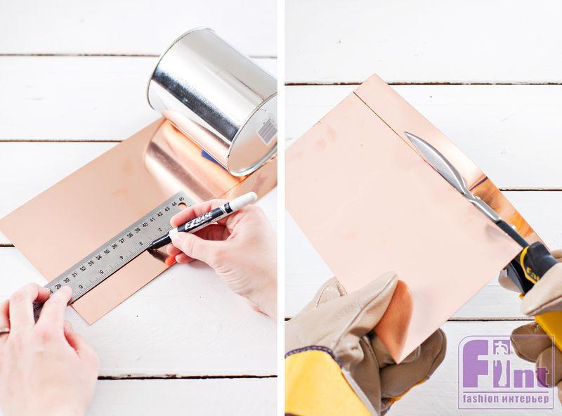 Шаг первый. Отметьте высоту вашего контейнера на медном листе и нарисуйте линию в качестве направляющей для резки и, используя ножницы по металлу, отрежьте нужную полосу. При работе с металлом не забудьте надеть защитные перчатки.