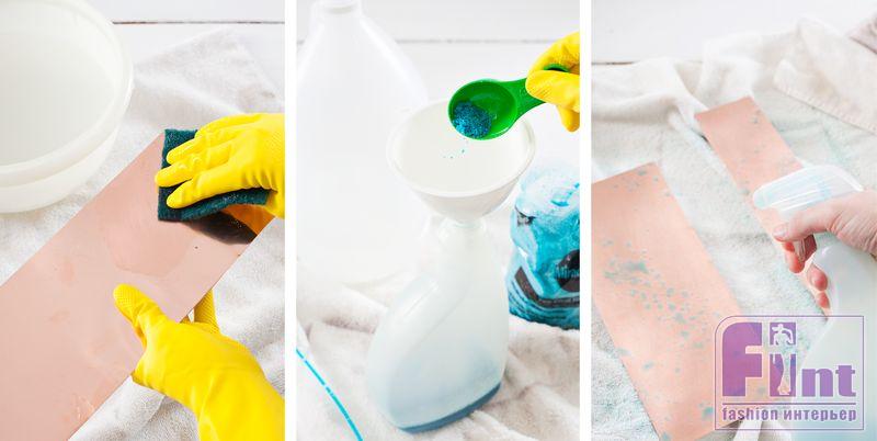 Шаг четвёртый. Неравномерно (пятнами) нанесите распылителем смесь на медный лист и оставьте примерно на 2 часа, пока медь не окислится и не проявится красивый бирюзовый узор окисления. Если вам не понравится рисунок окисления, вы можете перевернуть медный лист и обработать раствором другую сторону