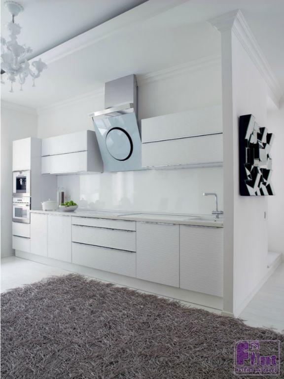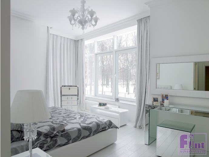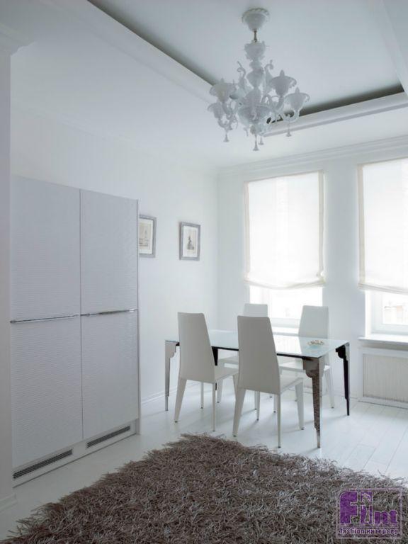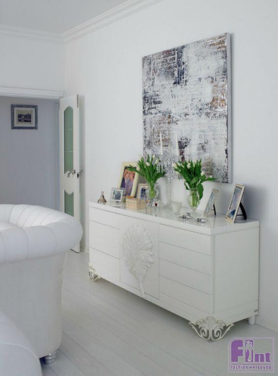 Сначала Яна думала сделать белой только гостиную: «Это ведь Женина стихия: белые стены, диваны, зеркала — словно на катке!» Так как кухня примыкает к гостиной, то и её сделали белой, несмотря на все волнения: «Я всегда мечтала о белой кухне, но не решалась — мне казалось, что это непрактично. Но на мебельной выставке в Москве мы увидели абсолютно белую модель кухни — и не устояли. Оказалось, что это даже удобно: этот цвет очень дисциплинирует, а с нашим графиком это важно даже на кухне!» Из гостиной белый цвет быстро распространился на остальные комнаты, требуя всё больше и больше белой мебели, — от цветных предметов решено было отказаться совсем, и даже цветочные букеты в доме состоят только из белых цветов. Из каждой поездки Яна привозила если не диван, то уж точно название новой марки, которую потом заказывала на месте. «Эту зеркальную инсталляцию я приобрела на Миланском мебельном салоне, серебряные рамки для фотографий и настольную лампу в гостиной привезла из Америки.