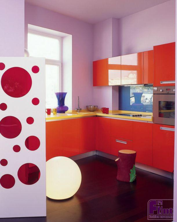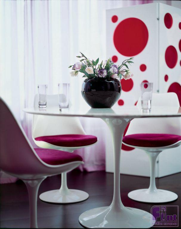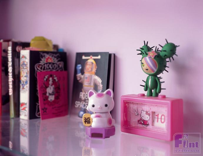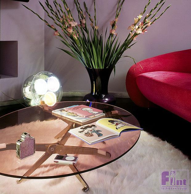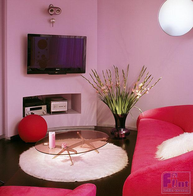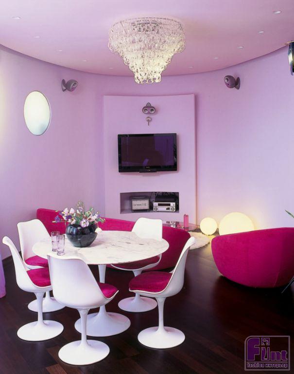 В качестве основного цвета по просьбе хозяйки квартиры был выбран розово-сиреневый. В этот цвет выкрашены все стены в комнатах, двери и даже тонирован потолок. Большая часть текстиля, мебели и аксессуаров также выполнены в различных оттенках розового и фиолетового.