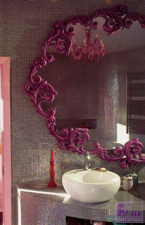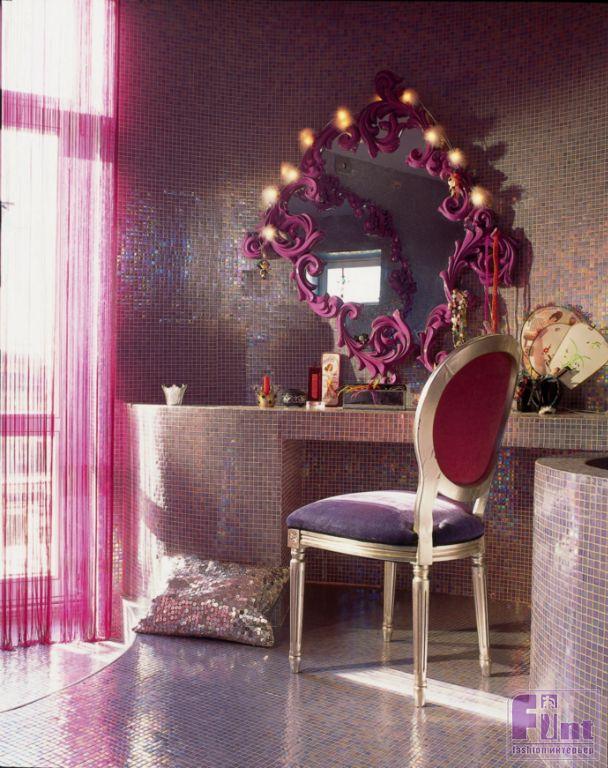 Ванная комната Маши Цигаль похожа на шкатулку с драгоценностями. Вместо обычной ванны - отлитый из бетона мини-бассейн, в котором может поместиться три взрослых человека. Большое светлое окно от пола до потолка украшено стильными нитяными шторами. Встроенная столешница с изящной накладной раковиной служит удобным туалетным столиком. На полочках, встроенных в ниши, хранятся спрятанные от глаз банные принадлежности. И стены, и пол, и мебель, отлитая из бетона, выложены мозаикой. А классическая люстра из розового хрусталя и зеркало в барочной раме сиреневого цвета завершают картину и усиливают ощущение будуарности.