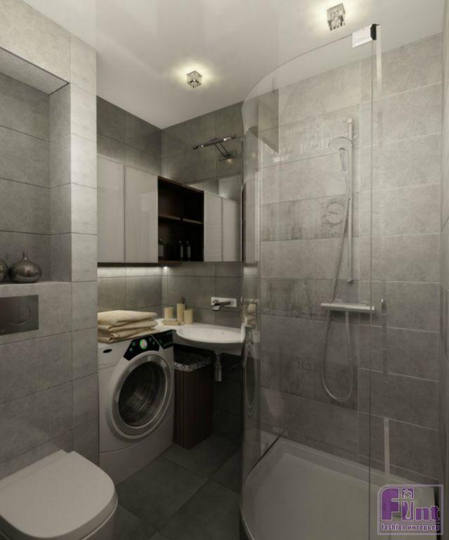 Небольшой санузел выполнен в серых тонах, воспроизводящих цвет бетона. При этом, в таком довольно скромном по площади санузле, нашлось место для стиральной машины и удобных мест для хранения в виде навесных закрытых полок.