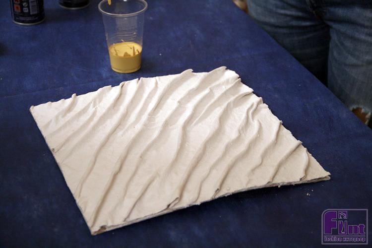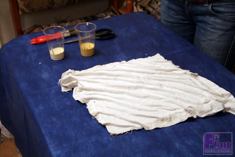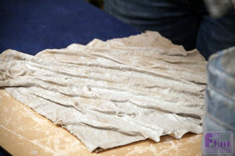 Руками сминает ткань так, чтобы на ней образовался рельеф и ждём, когда изделие высохнет. Срезаем излишки ткани обычными ножницами.