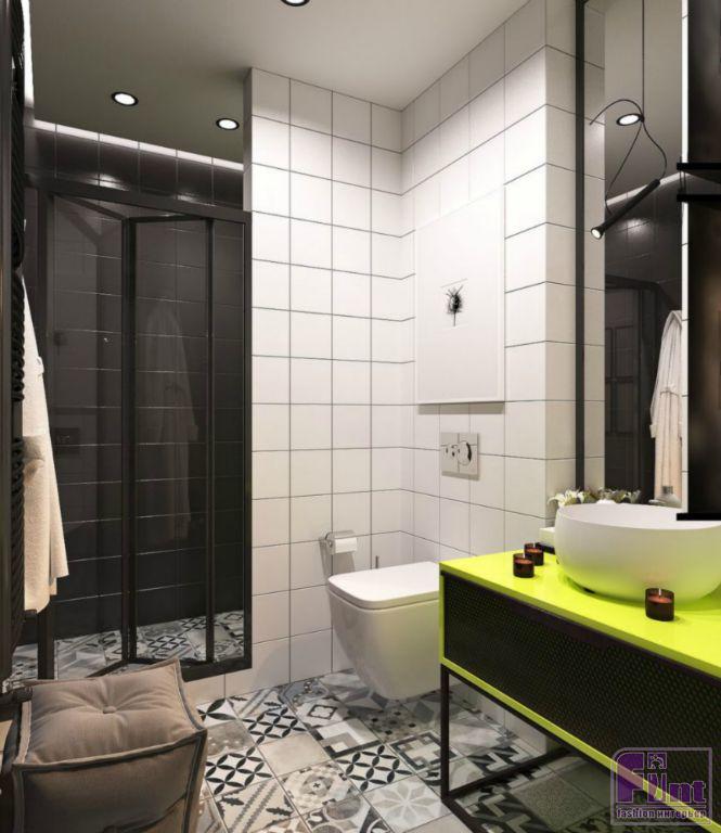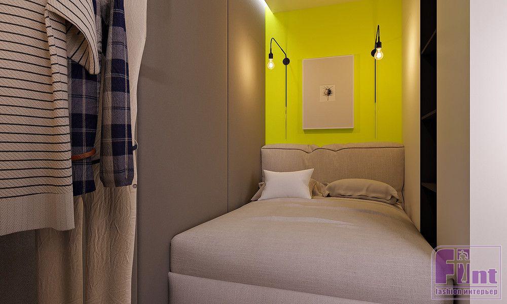 Стена между кухней и спальней служит местом хранения одежды и имеет удобные книжные полки, обращённые в сторону комнаты. Каждая функциональная зона визуально акцентирована тем или иным художественным приемом: цветом, подсветкой, конструкцией, отделочным материалом, декором. Яркие вспышки фиолетового цвета и зелёного лайма создают необходимое настроение. Облик прихожей формируют яркие панели шкафов. Зелёный «неоновый» цвет оживляет также и нейтральную гамму ванной комнаты.