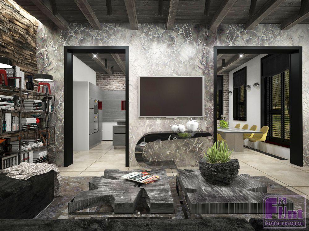 При всей несговорчивости в определении общего стиля, молодые люди оказались на редкость открыты к экспериментам с цветами, формами и фактурами. От шале были взяты элементы деревянных перекрытий, каменная кладка, камин и текстильные аксессуары. В стиле лофт оформлены стены «под бетон». Светильники и формы мебели дизайнер также предпочла современные.