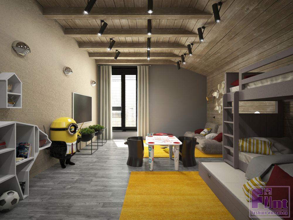 В детской главной задачей стало правильно зонировать помещение: комната предназначалась для близнецов: мальчика и девочки. И вполне естественно, что интересы у детей - разные. Функционально дизайнер разделили помещение на четыре зоны: для отдыха, игр, просмотра телевизора и обучения. В качестве цветового решения Елена выбрала нейтральную бежевую гамму с акцентами жёлтого и серого.