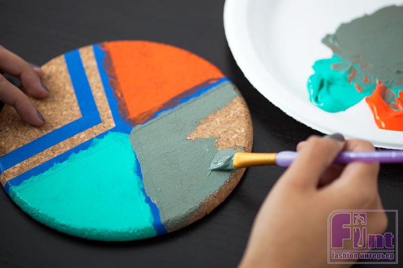 5. Смешайте Ваши краски (или используйте стандартные цвета) и раскрасьте Ваш рисунок. Дайте время Вашим часам высохнуть и нанесите еще 2-3 слоя краски, пока не достигните желаемого цвета. Количество слоев зависит от впитывающих качеств основы (в нашем случае – пробкового диска).