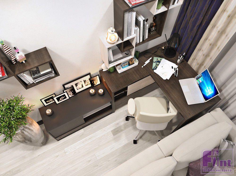 Рабочее место составляет часть гостиной комнаты. Заказчики согласились с предложением дизайнера добавить ярких акцентов в интерьер. Одним из таких ярких акцентов гостиной стал встроенный камин в современном стиле. Для выделения каминной зоны дизайнер предложила декор с акцентной стеной, выложенной грубым природным камнем, подчёркивающим брутальность живого огня.