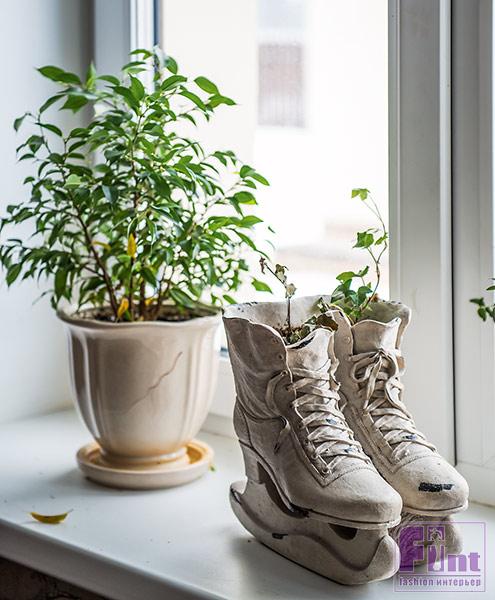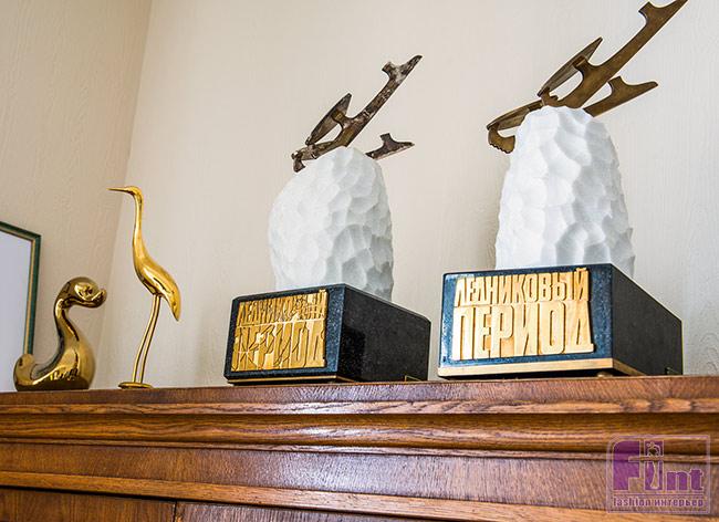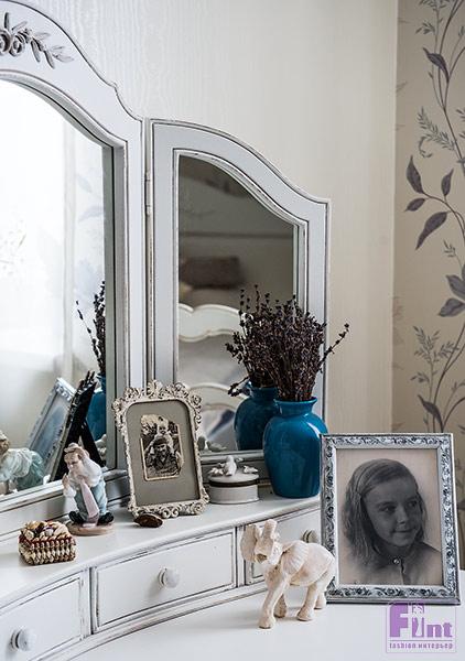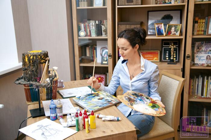 Просторная ванная комната в доме Ланской — мечта любой женщины. Здесь есть окно, открывающее прекрасный вид на поле и Троицкий храм. Стены выложены мозаикой в сиреневых тонах, пол с подогревом, ванна со стеклянными перегородками, чтобы служила и как душевая кабина, туалетный столик с зеркалом, перед ним — фиолетовое плюшевое крутящееся кресло. Получилась полноценная актерская гримерная со шторами, цветами в фиолетовых горшках, картинами на стенах.