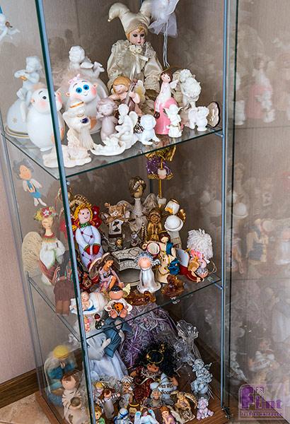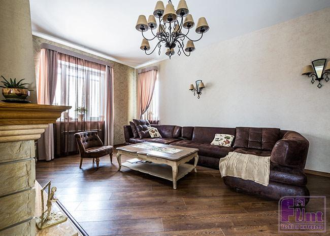 В гостиной на стенах также обои под покраску, окрашенные в бронзовый цвет. На полу — дубовая паркетная доска. Для этого помещениия актриса долго искала объёмную люстру и бра с бежевыми плафонами. Двери испанского производства: на первом этаже — темные, на втором — светлые. На подоконнике — цветочные кашпо в виде пары коньков. Их маме актрисы, тренеру на проекте Ильи Авербуха «Ледниковый период» Елене Масленниковой, подарил телевизионный ведущий и шоумен Дмитрий Хрусталёв на день рождения.