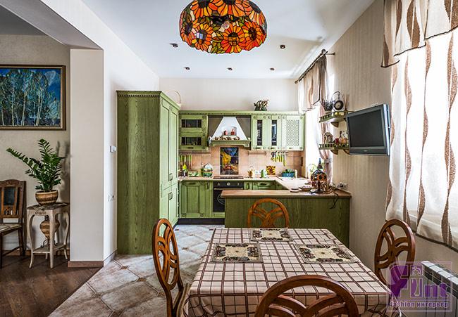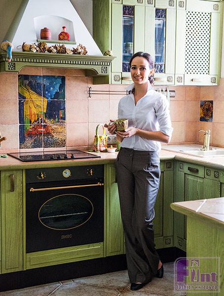 Самое яркое место в доме – кухня жизнерадостного зелёного цвета. Кухонный «фартук» выложен из рыжеватой плитки с панно по мотивам Ван Гога - любимого художника актрисы. Обеденный стол когда-то принадлежал прадедушке Валерии и отлично вписался с интерьер столовой, а оригинальные стулья к нему докупили позже. В столовой стоит антикварный, ни разу не реставрировавшийся буфет начала прошлого столетия, доставшийся Ланской также от прадедушки, как и два стула в гостиной. На полу — бежевая плитка, стены выкрашены в кремовый тон, на окнах — шторы, сшитые мамой актрисы. Отсюда есть выход на террасу.
