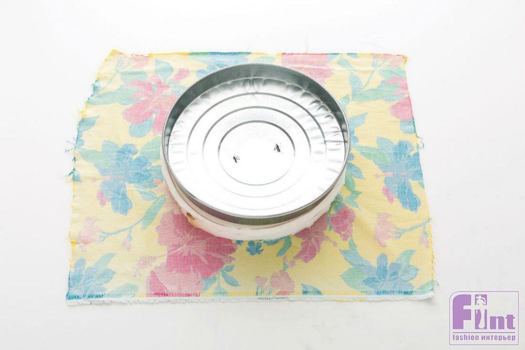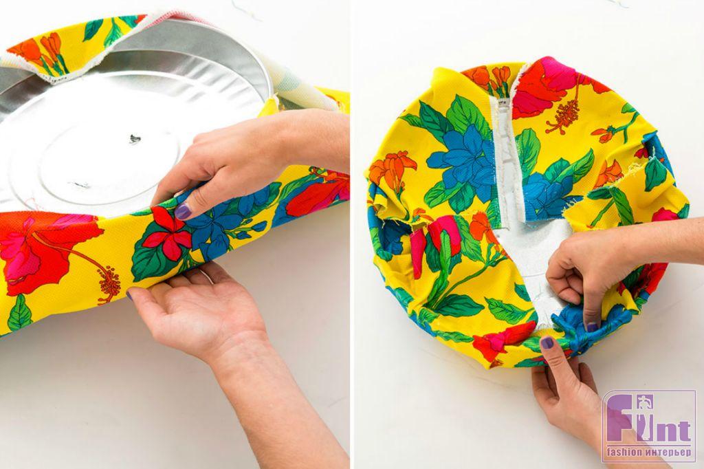 Помести эти два круглых куска поролона и крышку от бачка поверх квадрата из ткани. Ориентировочный размер квадрата ткани должен быть около 75×75 см (в зависимости от размеров крышки). Приклейте с помощью клеевого пистолета ткань к обратной стороне крышки контейнера, равномерно натягивая полотно на «подушку» будущего сидения табурета. Излишки ткани можно срезать.