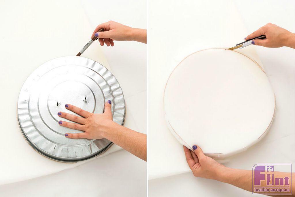 Используйте плоскогубцы, чтобы снять ручку крышки мусорного ведра. Затем измерьте диаметр  круга крышки и перенесите его на поролоновую подкладку. Вырежьте два одинаковых круга из поролонового листа, используя канцелярский нож.