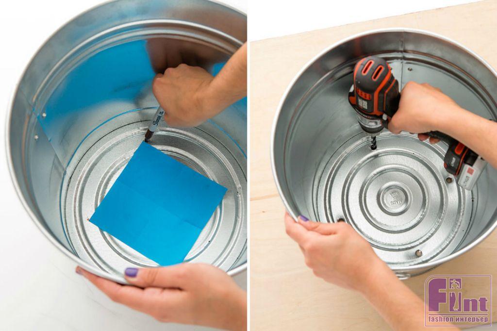 Разметьте места под отверстия для ножек. Сделать это можно очень просто и быстро, используя ровный квадрат из обычной бумаги. Сначала сложите квадрат два раза пополам в двух перпендикулярных направлениях, найдя середину бумажного квадрата. Теперь его можно ровно поместить в центр ведра. Маркером поставьте точки, ориентируясь на углы бумажного квадрата. Так мы буквально одним движением, без сложных измерений можем равномерно разметить места для отверстий под ножки и просверлить дно бачка.