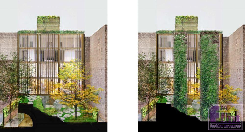 А вот задний фасад демонтируют практически полностью, заменив его масштабной конструкцией из стекла и бронзы с вертикальным озеленением. На заднем дворе разобьют сад, из которого можно будет попасть на нижний ярус особняка, где будет расположен бассейн. Ранее на реконструкцию планировалось потратить около 6 миллионов долларов США.