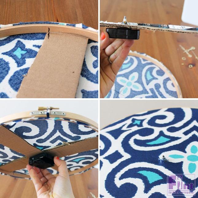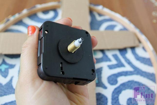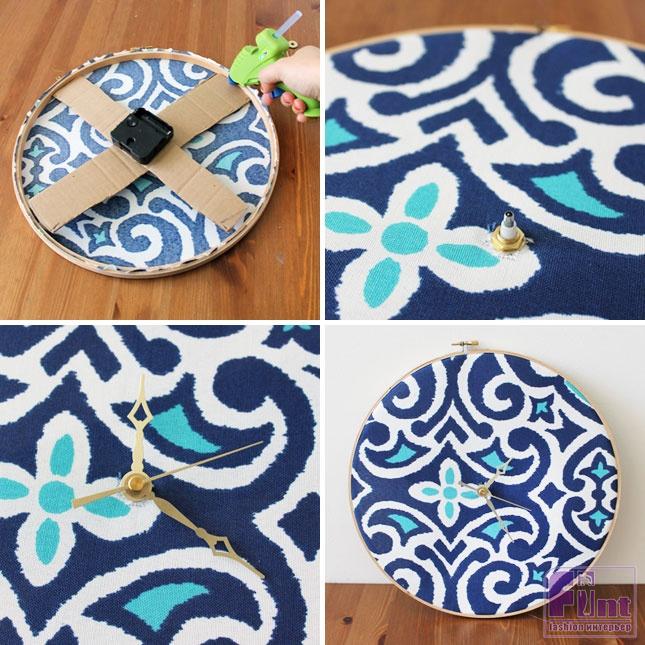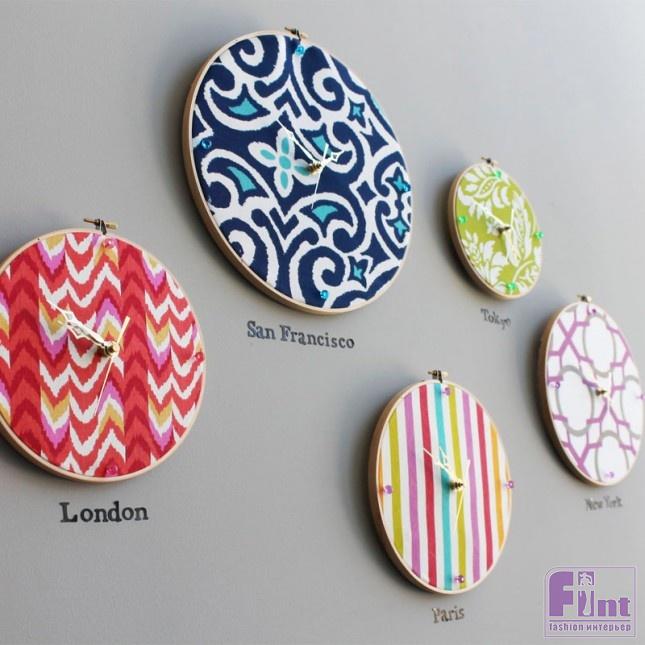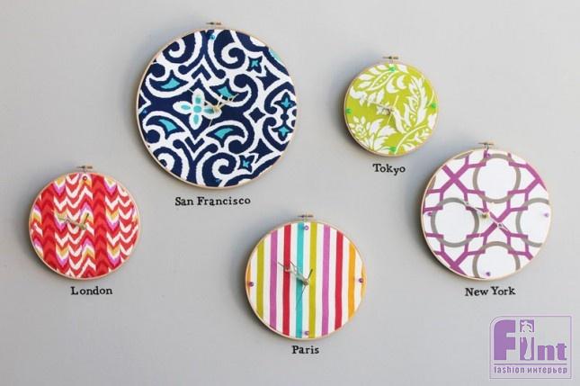 Но, наверное, самым ярким способом украсить свой дом с помощью Hoop Art являются настенные часы из пяльцев. Кажется, что сделать такие часы — в пяльцах — очень сложно. На деле это легко и просто, а всё, что вам понадобится для этого: часовой механизм со стрелками, ткань, пяльца и немного картона от гофрокоробки.