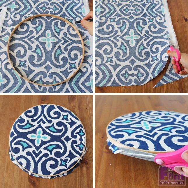 Размечаем ткань по диаметру пяльцев и вырезаем окружность. Вставляем вырезанный тканевой круг в пяльцы и туго натягиваем, избегая морщин.