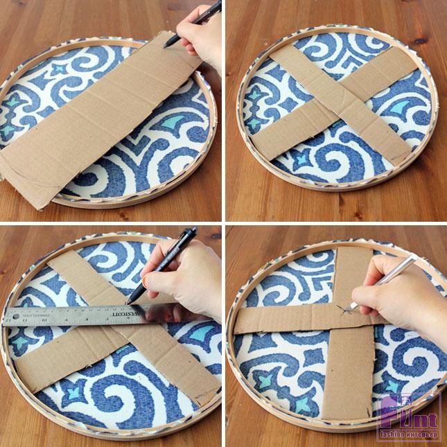 С обратной стороны вставляем крест накрест две полоски из гофрокартона и закрепляем их в пяльцах. С помощью измерительных инструментов определяем центр круга и аккуратно проделываем отверстие под привод стрелок.