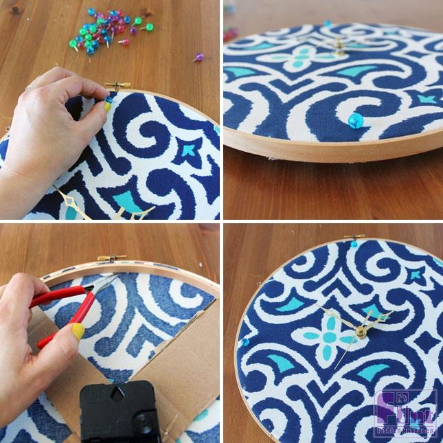 Осталось разметить на «циферблате» основные «часовые» отметки: 12, 3, 6 и 9 часов. Для этого можно воспользоваться различными предметами и аксессуарами – от ярких и красивых пуговиц и до стразов. Мы использовали канцелярские кнопки с пластиковыми «шариками» на концах. Чтобы кнопочки лучше держались, нужно попасть в крест из гофрокартона, который мы закрепили с обратной стороны пяльцев. А чтобы кнопки не выпали из гофрокартона и ткани, их металлическое остриё можно загнуть с помощью плоскогубцев. Готово!