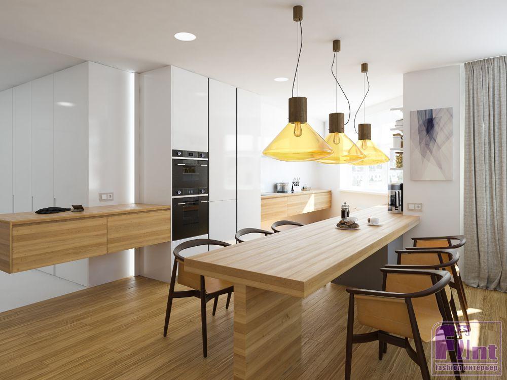 Отдельным пожеланием заказчиков был интерьер в минималистичном стиле. Авторы проекта сделали ставку на практичный и современный дизайн: сочетание светлых тонов с насыщенным медовым оттенком дуба. Мебель подбирали соответствующую общей концепции проекта. «Сложность оснащения квартиры мебелью заключалась в том, что зона кухни была нестандартной по планировке, и поэтому кухонный гарнитур и барную стойку, служащую также обеденным столом, мы разрабатывали сами», - говорит Сергей. К авторской мебели дизайнеры добавили современные стулья.