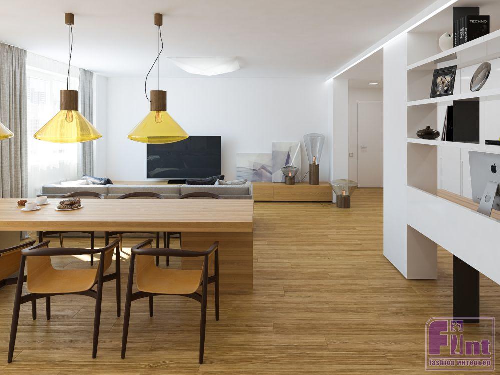 Изюминкой общественной зоны стали дизайнерские светильники - потолочные над обеденным столом и напольные в зоне ТВ. Форма светильников сделана по подобию формы французских кексов к завтраку.
