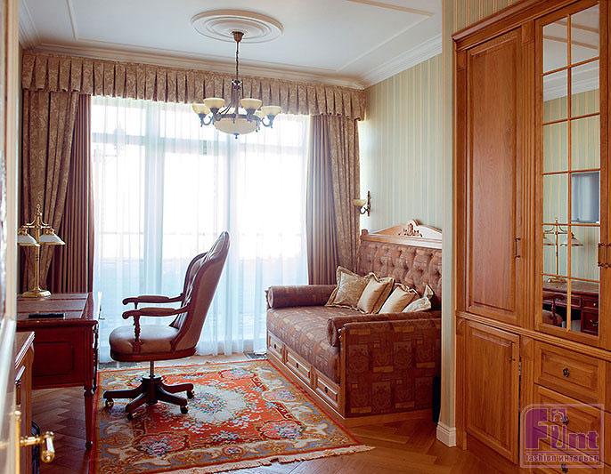 — А как же! Это кабинет мужа. От всего остального интерьера его отличает тёмная добротная мебель. Сразу видно, что это мужское пространство. Там совершенно чудесный диван, на который сразу хочется сесть, почитать книгу, посмотреть фильм, обсудить новости. Да просто закрыть двери и поговорить с пришедшим другом наедине.