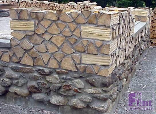 Поперечное сечение дров, используемых в кладке, может быть любым, а вот их длина – строго одинаковой. Торцы дров можно немного выпускать за плоскость стены (на 2-3 см), чтобы придать стене выразительную рельефную текстуру. Дрова перед укладкой лучше расколоть, потому что цельные чурбаки со временем трескаются и открывают влаге доступ вглубь стен. От коры следует избавиться, очистив от неё поленья до начала строительства. Специалисты рекомендует прошлифовать торцы чурок и обработать их льняным маслом или олифой, чтобы повысить водостойкость стен.