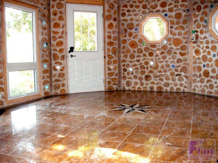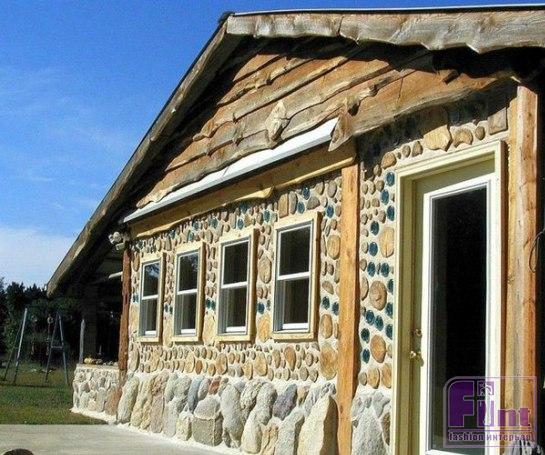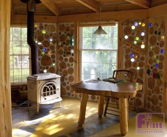 Даже самый скромный коттедж с дровяными стенами превращается в настоящее произведение деревянного зодчества. Если проявить немного фантазии, используя в кладке стен разноцветные стеклянные бутылки, то можно создать неповторимый по красоте дизайн не только снаружи, но и внутри здания.
