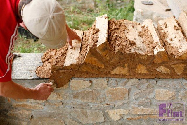 Влажность свежеспиленного «строительного материала» должна быть минимальной, поскольку дрова впитывают в себя достаточно много влаги из глиняного раствора. Перед началом работ их нужно просушить под навесом не менее 2 месяцев.