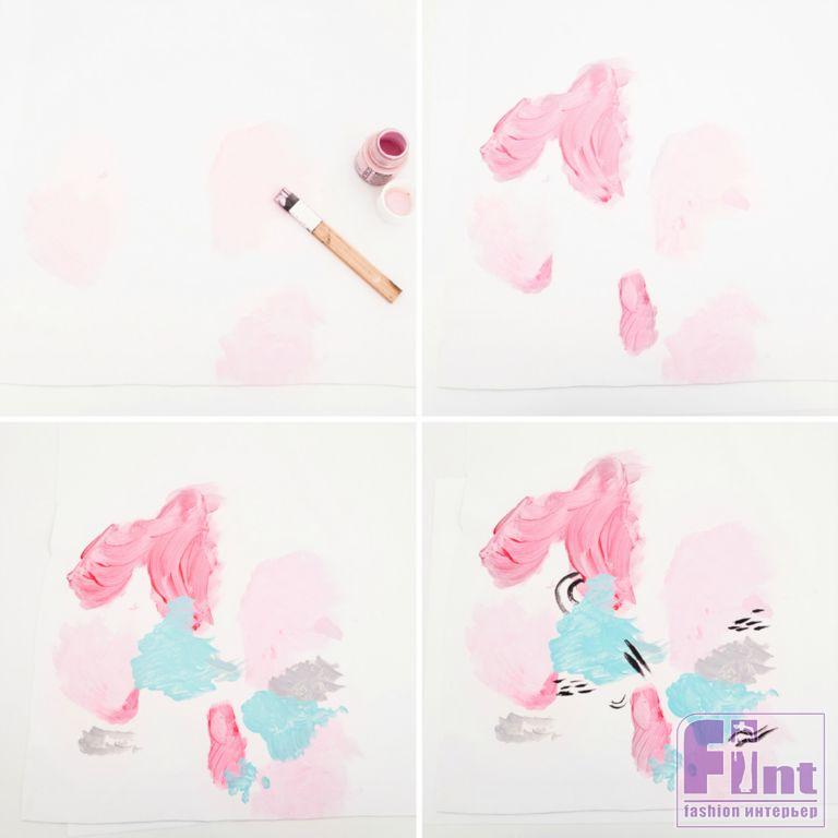 Для начала нужно украсить обрезки кожи абстрактным рисунком. Начните со светлого цвета и нарисуйте абстрактные широкие мазки. Используйте плоскую кисть, чтобы изобразить подобие лепестков цветов. Добавьте другие цвета, нарисовав аналогичные мазки в хаотичном порядке. Завершите оформление кожи некоторыми чёрными чёрточками, выполненными тонкой кистью. Дайте краскам полностью высохнуть.