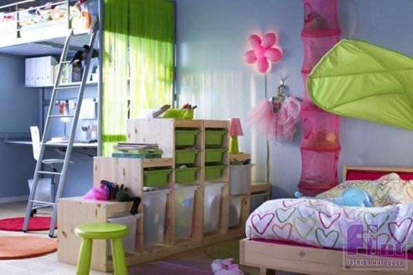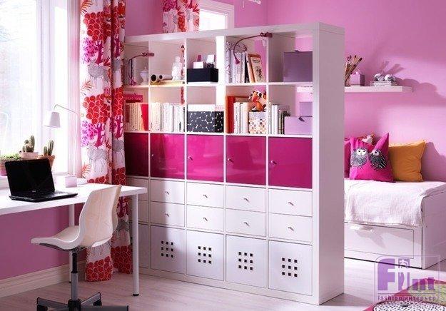 В детской комнате такой стеллаж, как правило, «прячет» игровую зону от учебной, чтобы не отвлекала. На его полках можно разместить как игрушки, так и учебники.