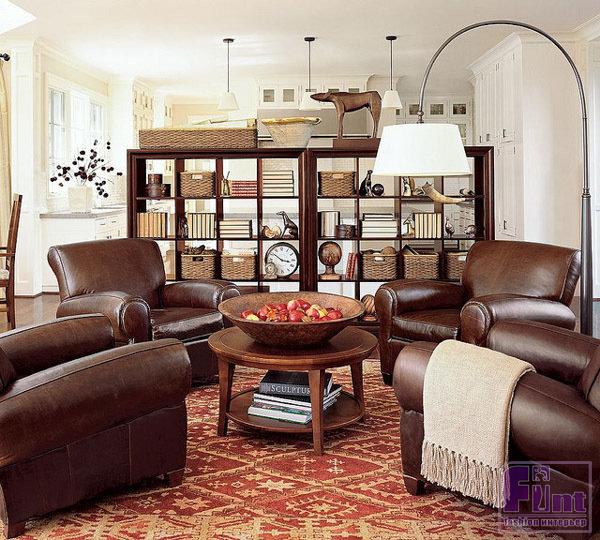 Если стеллаж приобретается в гостиную, значит там надо выделить зону отдыха и мини-кабинет. На его полках со стороны гостиной хорошо будут смотреться цветы, а со стороны рабочего места можно удобно и компактно расположить книги, канцелярию, принтер и т.д.