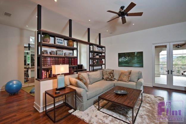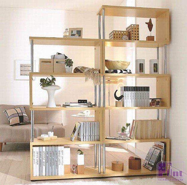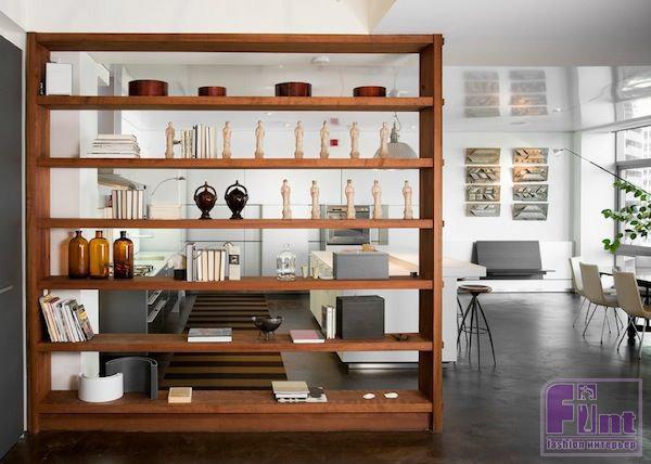 2. Использование для зонирования пространства. Можно сделать стеллаж на всю высоту помещения, когда надо создать видимость изолированных комнат. А можно закрыть им отделяемую часть лишь наполовину. Возможен и компромиссный вариант – модель в виде ступенек, которая тоже перегораживает комнату, но делает это очень «тактично», почти незаметно.
