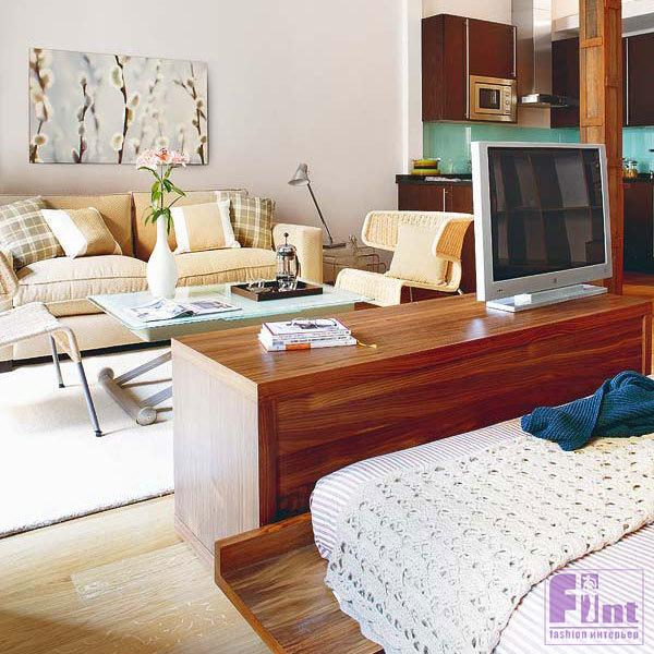 Перегородка в однокомнатной квартире часто выступает в роли подставки для теле- и аудиоаппаратуры. Зачастую она отделяет гостиную зону от кухни. В этом случае телевизор можно разворачивать в сторону обеих «комнат».
