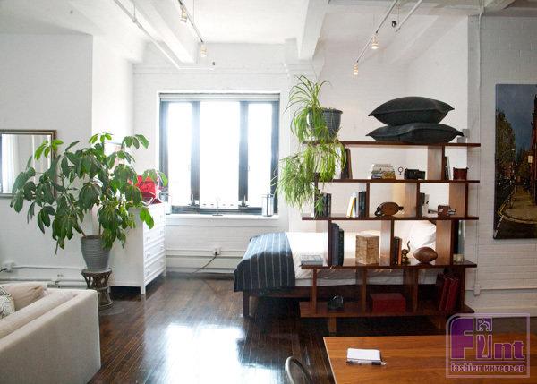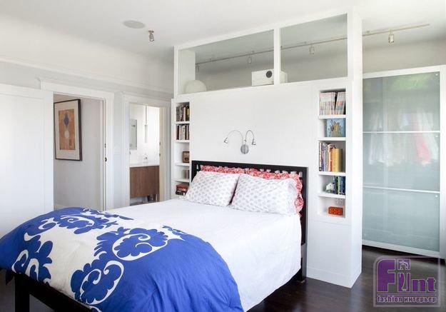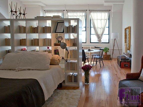 Отличный способ создать для кровати в однокомнатной квартире скрытую и интимную атмосферу – установить стеллаж.