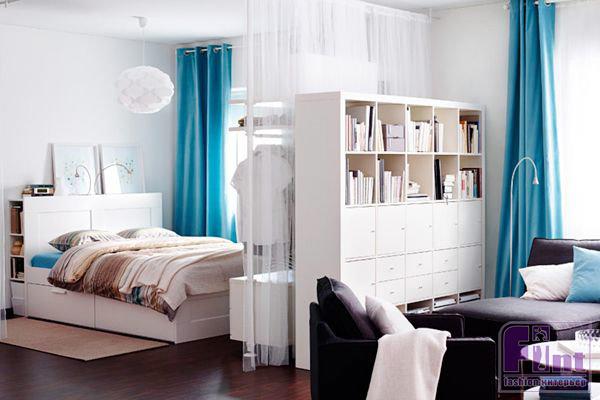 3. Функциональность, то есть возможность использовать стеллаж как место хранения вещей, к которым можно легко дотянуться с обеих сторон перегородки. Снизу, как правило, располагаются ящики, и в них укладывают те вещи, которые принято хранить в шкафах, гардеробе, и в этом случае от других мест хранения можно отказаться, увеличив, таким образом, жилое пространство. А сверху, на открытых взору полках, можно расставить мелкие предметы, не загромождающие пространство.