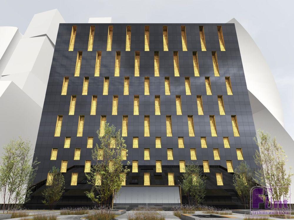 Фасады здания-«куба» сделают со структурным остеклением из дымчатого стекла. В качестве декоративных элементов и ограждающих конструкций архитекторы намерены использовать латунные ламели.