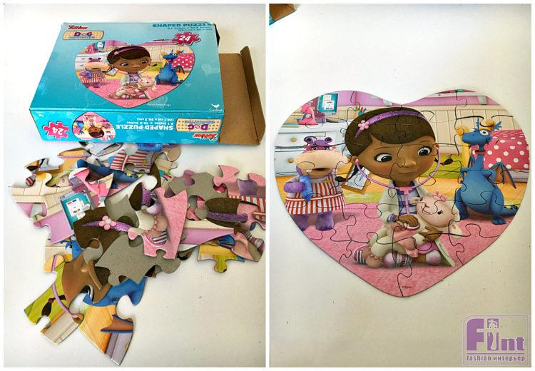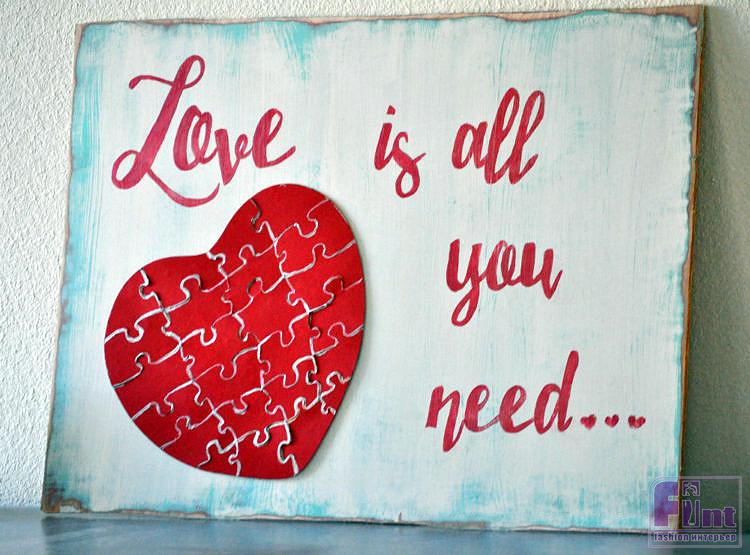 Осталось только покрасить той же краской наше сердечко из пазлов и с небольшими пробелами приклеить его к фанере. Готовое изделие можно повесить на стене, либо просто поставить на комоде или письменном столе, прислонив к стене.