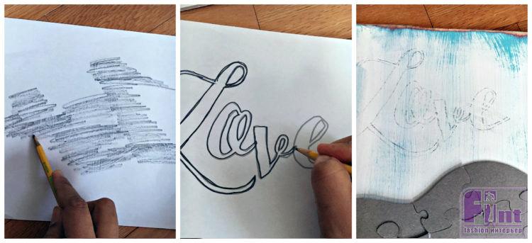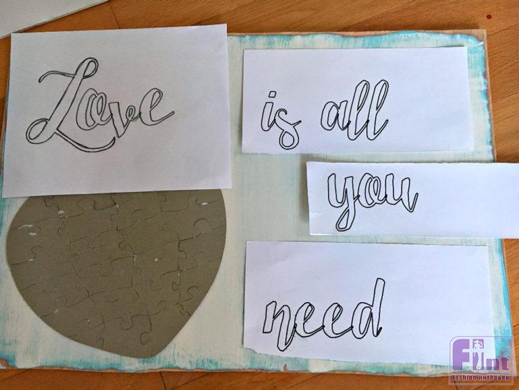 Затем приступаем к переносу фразы «Love is all you need» на поверхность окрашенной фанеры. Для этого мы распечатали фразу, написанную красивым шрифтом, на обычном принтере. Чтобы перенести буквы на дерево, можно воспользоваться одним из двух возможных способов. Разложив слова на фанере можно с сильным нажимом обвести их шариковой ручкой, стараясь не повредить бумагу. От нажима, буквы отпечатаются на фанере и их будет хорошо видно. Второй способ предполагает перенос слов с помощью эффекта «копирки». Предварительно заштрихуйте оборот бумаги с напечатанными словами обычным карандашом с мягким грифелем. Затем с обычным нажимом обведите буквы. Штриховка с обратной стороны перейдёт на фанеру, и Вы без труда сможете дорисовать слова, убрав бумажные распечатки.