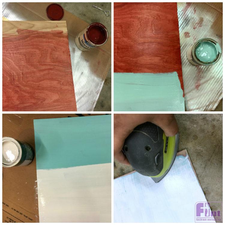 При окрашивании не нужно соблюдать аккуратность. Суть изделия – в его нарочитой небрежности, которая стилизует доску под старый материал. «Старины» добавит и ошкуривание поверхности белой краски, чтобы из под неё стала видна бирюзовая, а края «обнажали» не только бирюзовый слой, но и первый слой морилки. Ошкурить поверхность можно шлифовальным станком, или просто вручную. Получается состаренная поверхность с бело-бирюзово-коричневым окрасом, идеально подходящим под стиль шебби шик.
