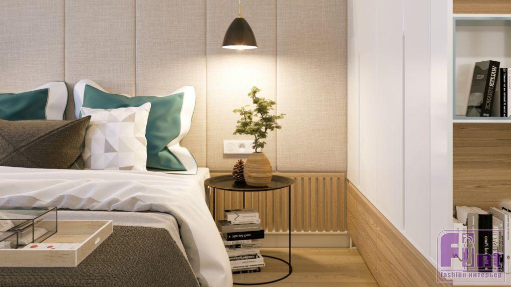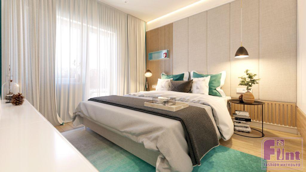 Визуально стилистику, заданную гостиной, продолжает спальня. Для эффекта «перетекания» одного пространство в другое дизайнеры спроектировали изголовье кровати из реечных и текстильных панелей, обитых брашированным хлопком. Акценты расставили с помощью текстиля: постельного белья и портьер.