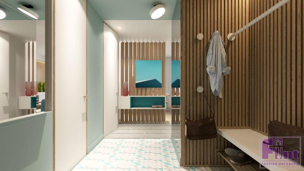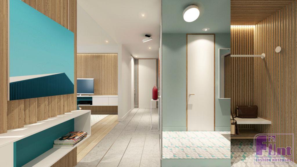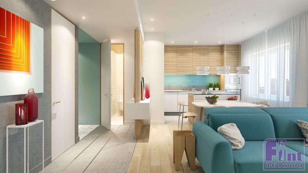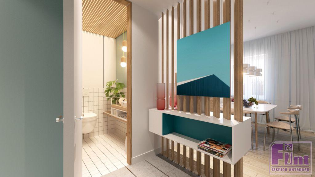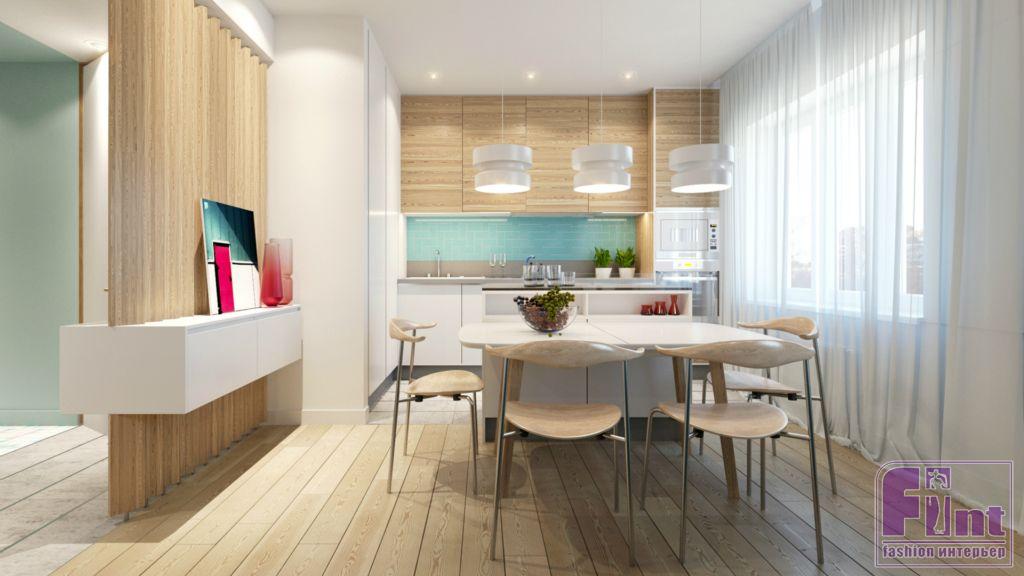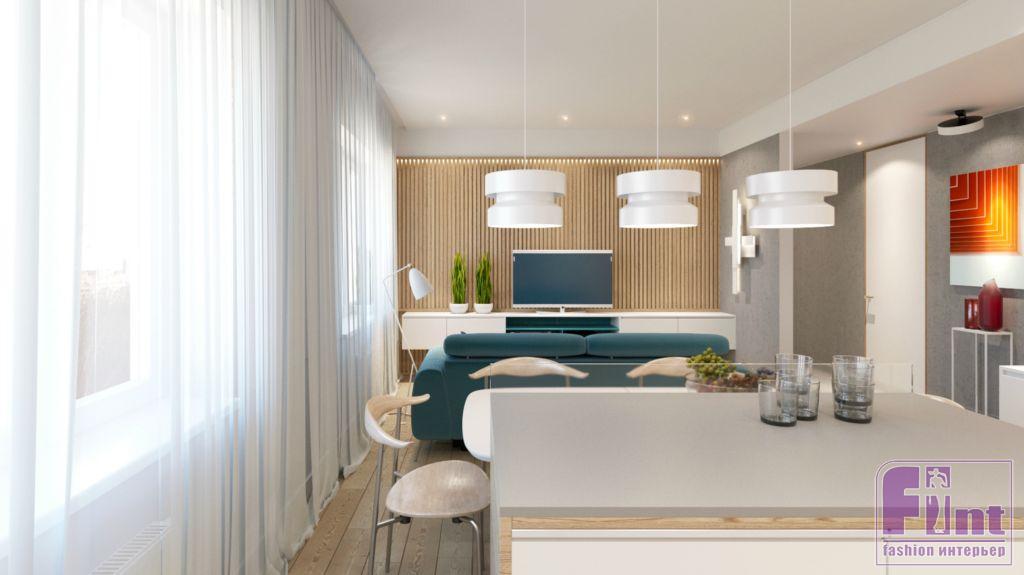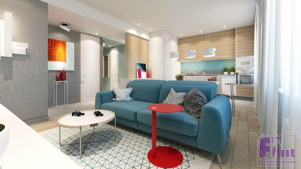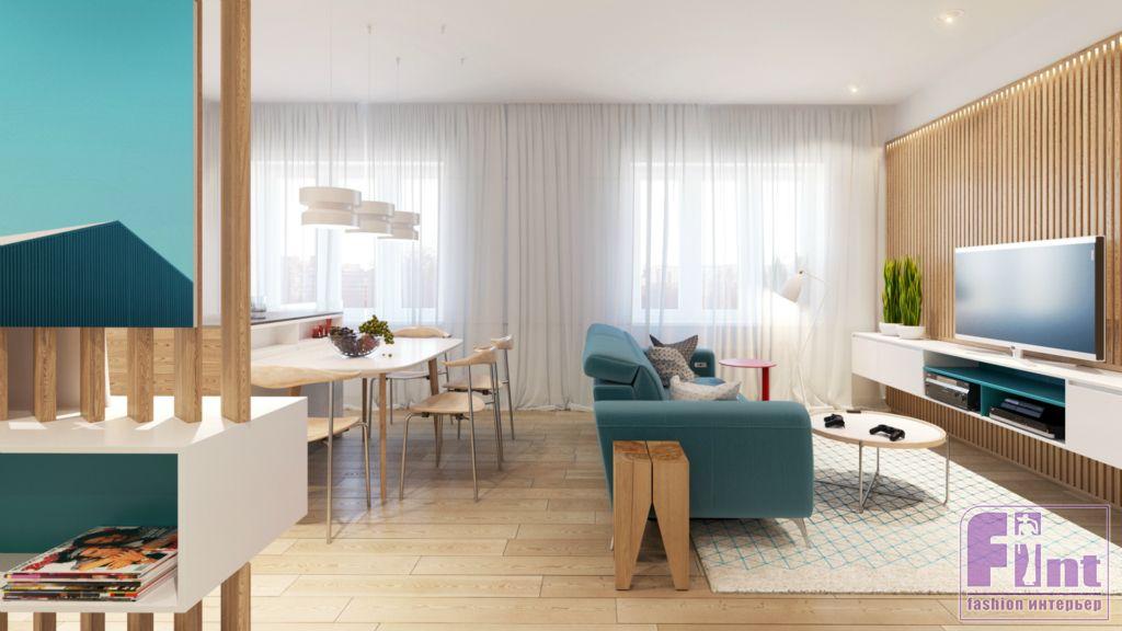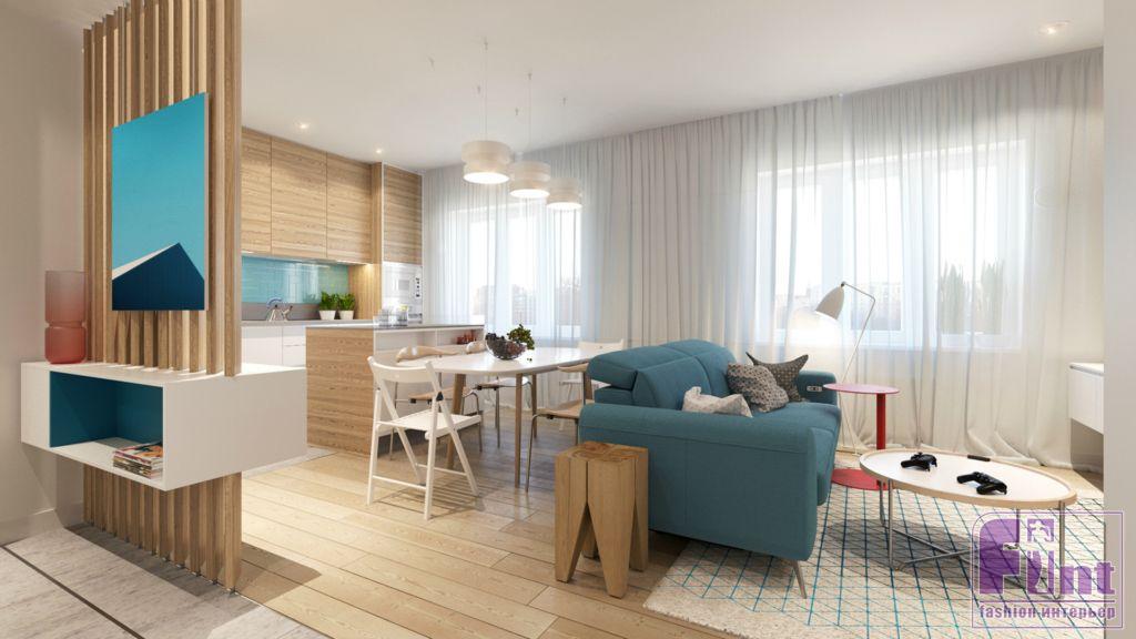 Гостиную-кухню Дмитрий и Андрей визуально разграничили от прихожей с помощью реечной перегородки, пересечённой консолью. Она работает на обе функциональные зоны: в прихожей несёт функцию открытой полки, а в гостиной - системы хранения. Кухню с островом изготовили на заказ по чертежам авторов проекта. Лаунж-зону авторы проекта акцентировали с помощью бирюзового дивана-кровати с трансформируемым подголовником и дизайнерского журнального столика.